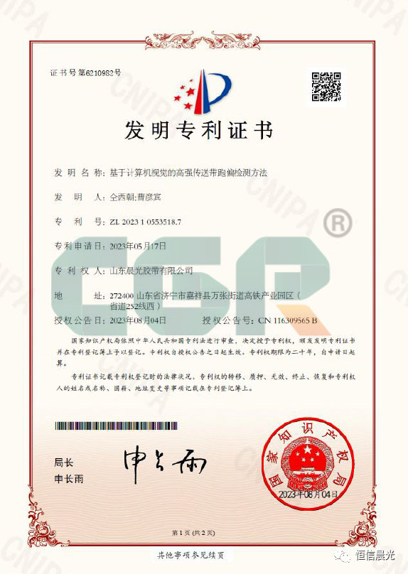 2023年08月04日,山東晨光膠帶有限公司新增獲兩項(xiàng)發(fā)明專利?!盎谟?jì)算機(jī)視覺的高強(qiáng)傳送帶跑偏檢測方法”、“一種高強(qiáng)傳送帶物料智能檢測方法及系統(tǒng)”。